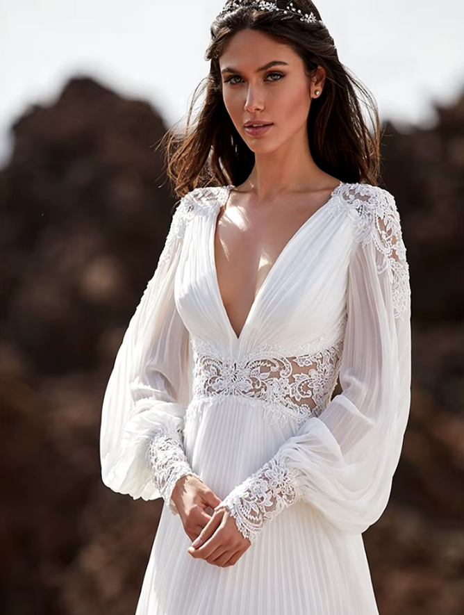 Langarm Boho Brautkleid Ejla mit V Ausschnitt Bodenlang