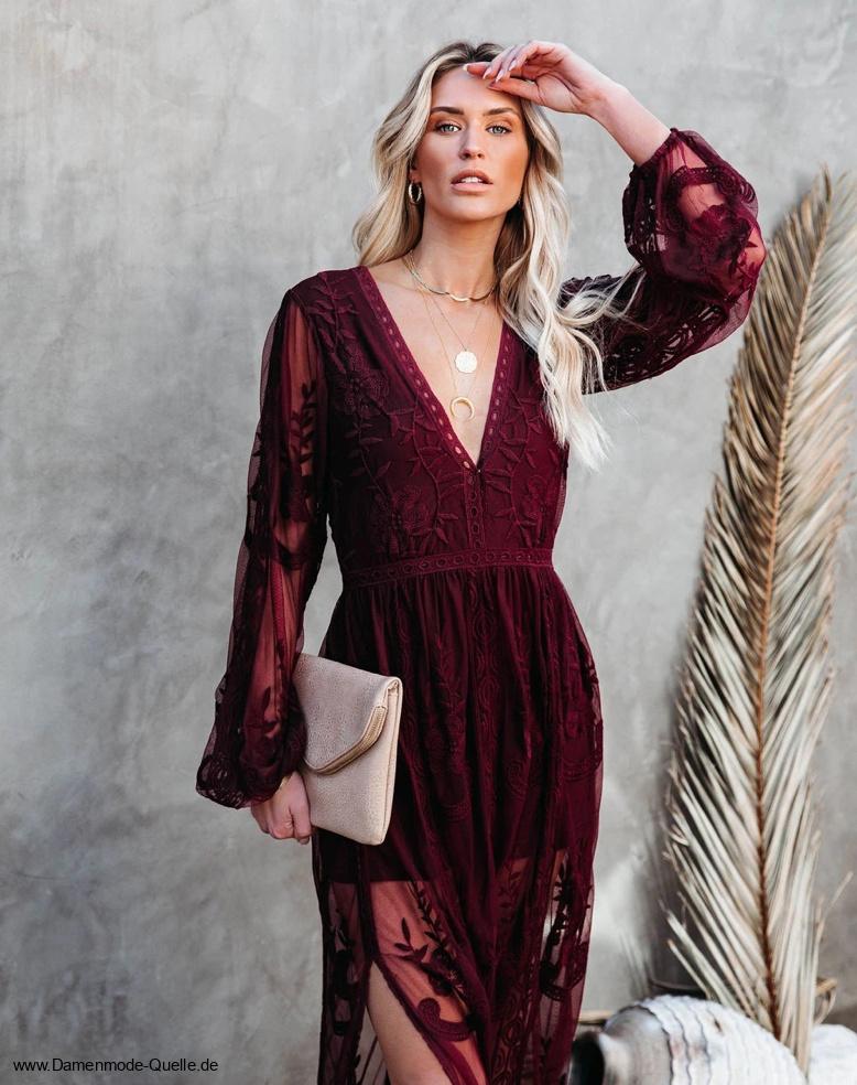 A Linie Boho Maxi Langarm Sommerkleid in Weinrot aus Spitze