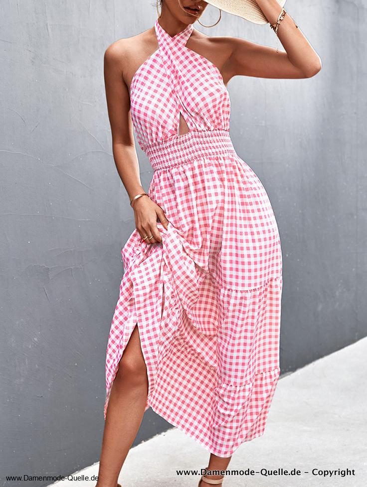 Neckholder Träger Maxi Sommerkleid in Weiß Rosa Kariert
