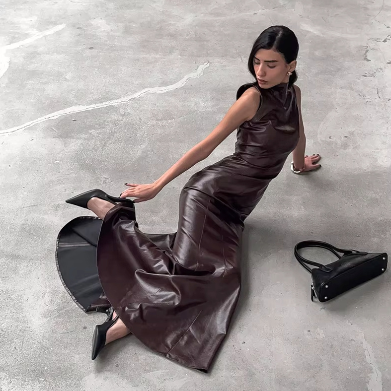 PU Leather Fit and Flare Women’s Long Dress in Dark Brown