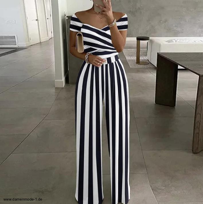 Damen Kurzarm Overall Jumpsuit Einteiler Benedikte Schwarz Weiß Gestreift