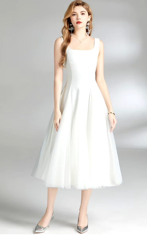 A Line Vintage Style Civil Wedding Dress Calf Length White