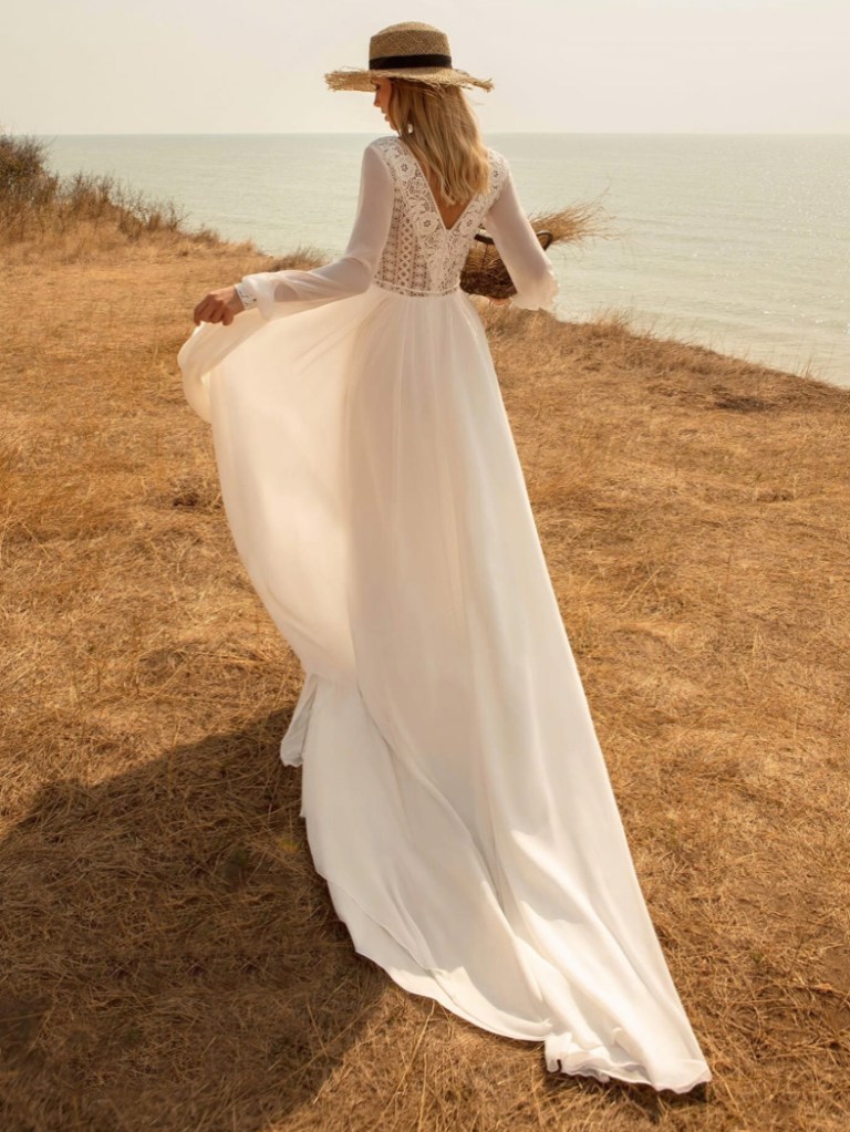 Long Sleeve Chiffon Boho Wedding Dress Femke with Brush Train and Lace