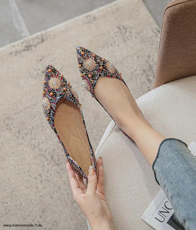 Spitzen Ballerinas Abendschuhe Elegant in Schwarz mit Perlen Stickereien