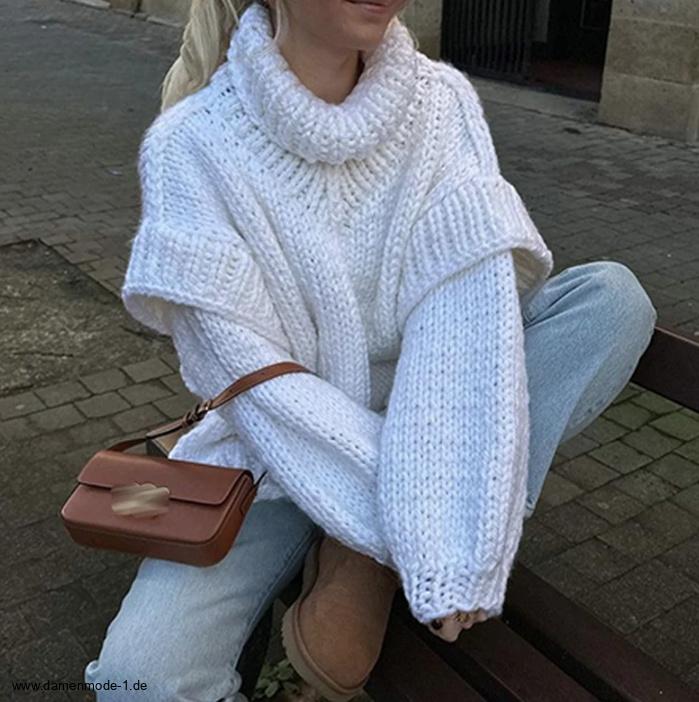 Warmer Rollkragen Langarm Patchwork Damen Pullover in Weiß