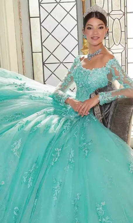 Long Sleeve Quinceanera Ball Gown Cheyenne with Tattoo Lace in Mint Green