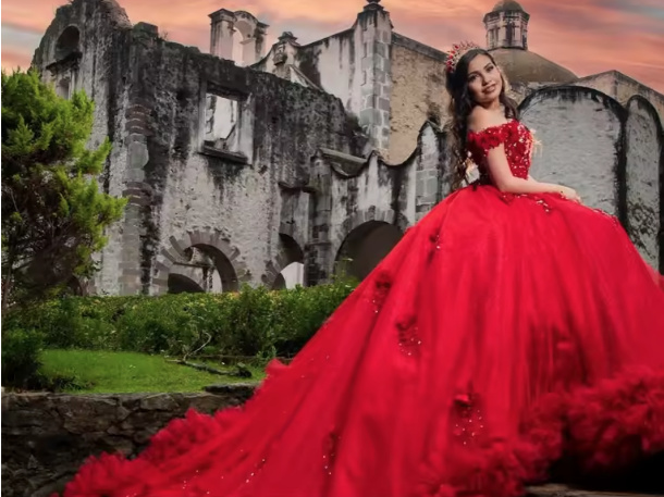 Off-the-shoulder Quinceanera ball gown Cindy in red with ruffles rhinestones and lace