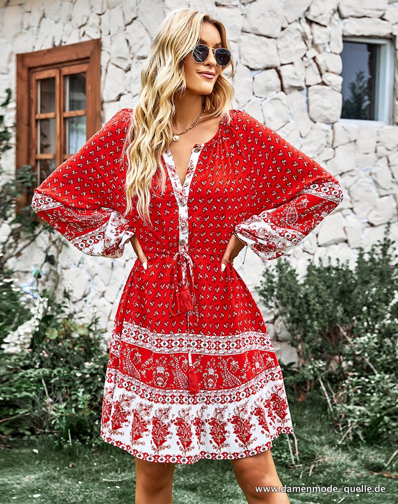 Viskose Boho Kleid Langarm Midi Kleid für Damen Elegant Rot