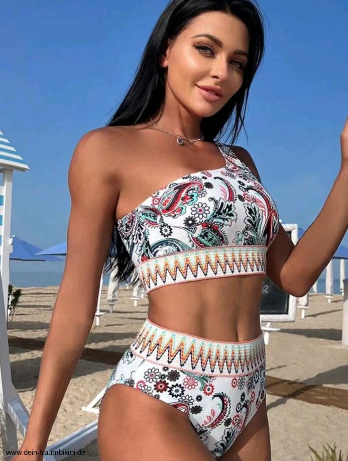 One Shoulder High-Waist Bikini Xuri Weiß mit Retro Muster