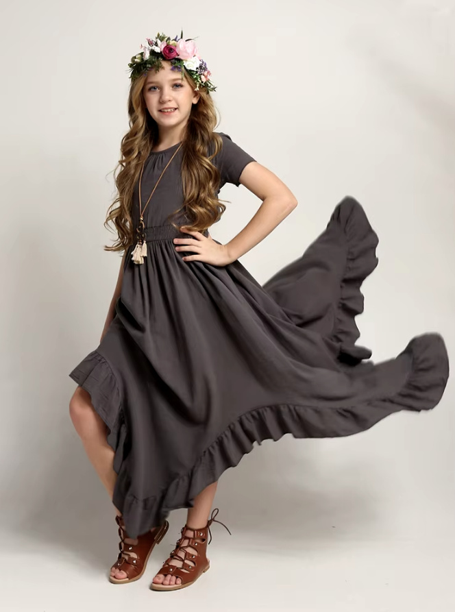 A Line Short Sleeve Boho Style Flower Girl Dress Christin in Dark Grey