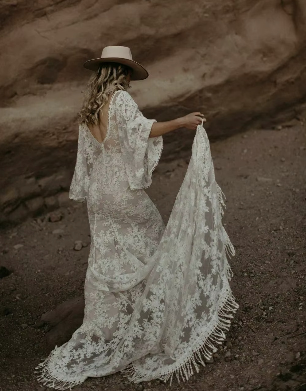 Boho Style Hippie Fit and Flare Lace Wedding Dress with Flare Sleeves