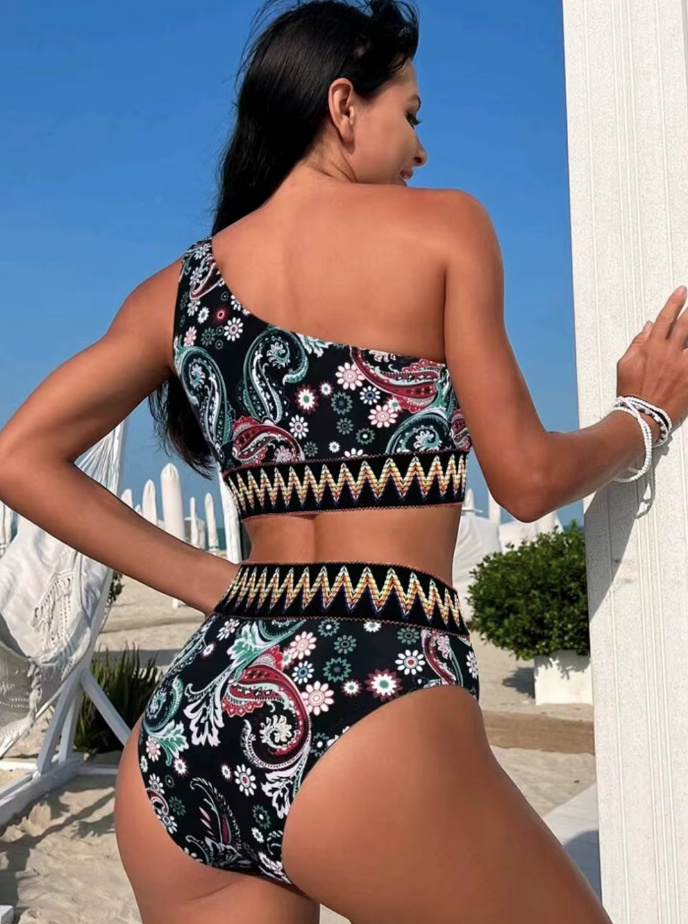 One-Shoulder High-Waist Bikini Xuri Schwarz mit Retro-Muster