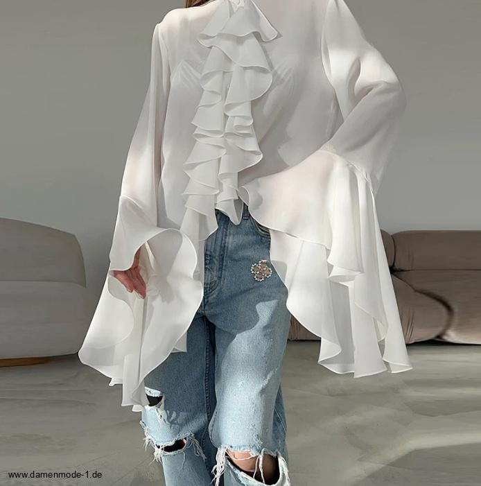 Damen Langarm Rüschenbluse in Weiß