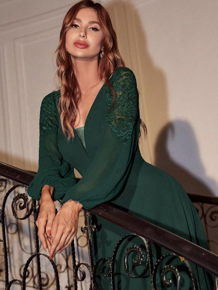 A Line Long Sleeve Dress Eve Elegant for Wedding Guests in Dark Green