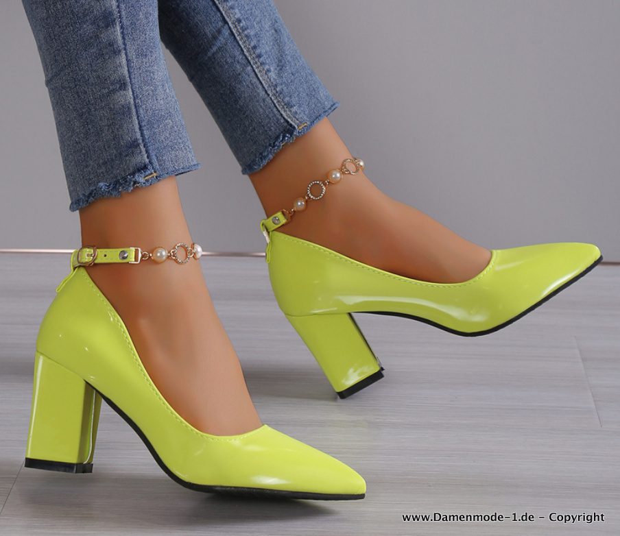 Luxury rhinestone patent leather ladies pumps with pearl chain up to size 43 in yellow
