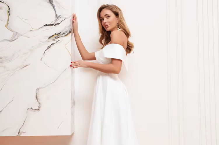 Shoulder-free A-line civil wedding dress Ermelina calf-length in white