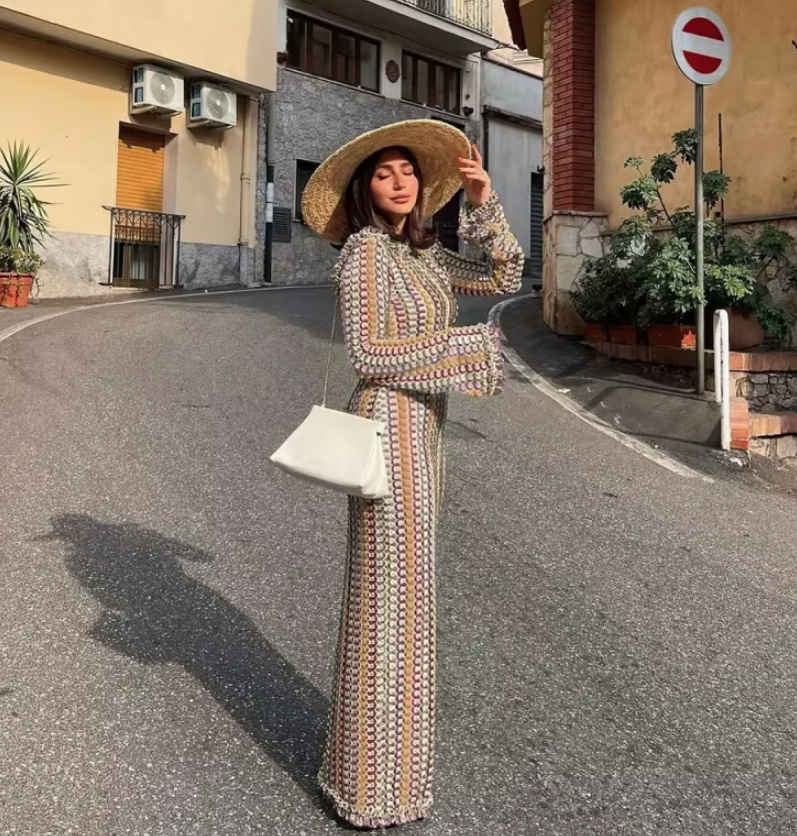 I Line Long Sleeve Knitted Beach Dress Cover Up Dress in Brown with Back Neckline