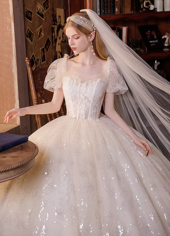 Klassisches A Linie Glitzer Brautkleid Bodenlang mit Puffärmeln