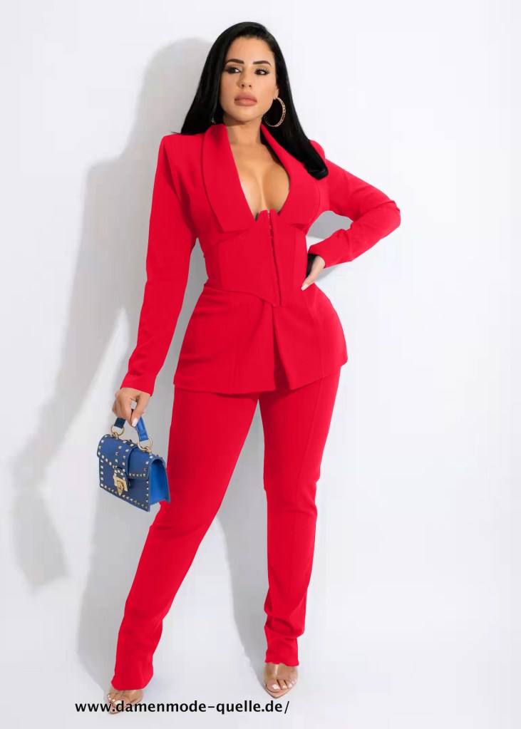 Damen Buisness Blazer mit Gürtel und Hosen Anzug Büro Set Rot