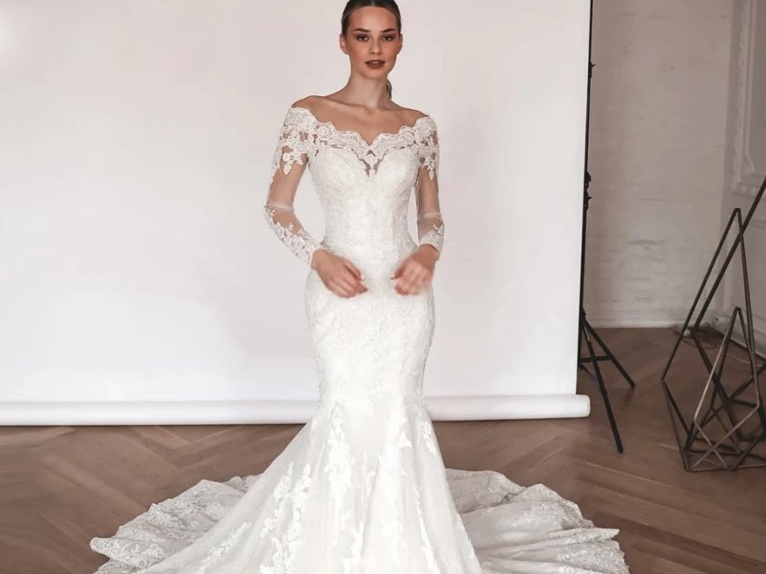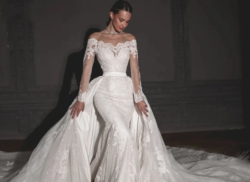 2 in 1 Luxury Wedding Dress Amelie Off Shoulder with Lace Train Detachable