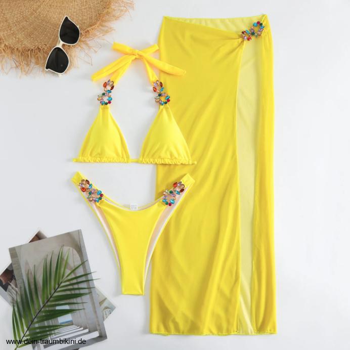 Halterneck Bikini Set mit Strass und Rock in Gelb