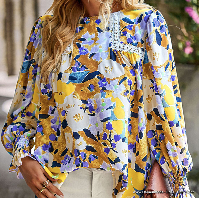 Langarm Sommer Shirt Damen Bluse mit Blumenmuster