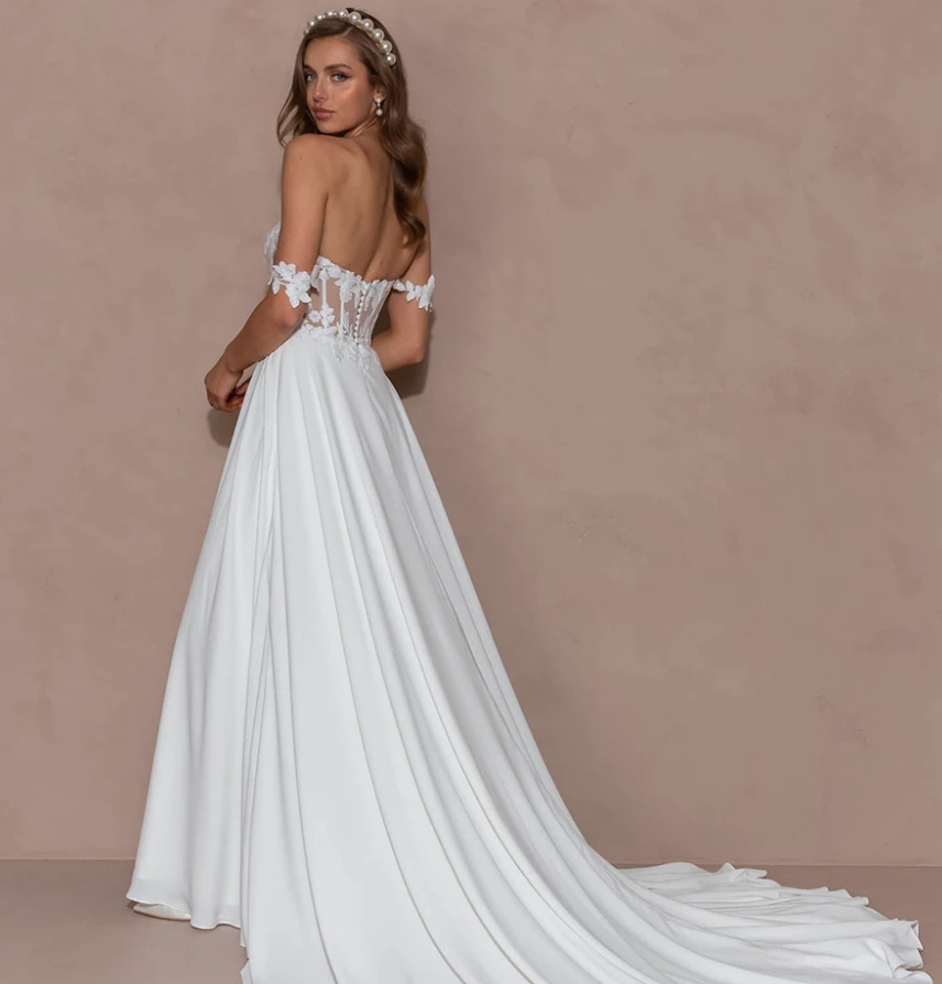Off-the-shoulder boho wedding dress Birka with lace and sexy slit floor length