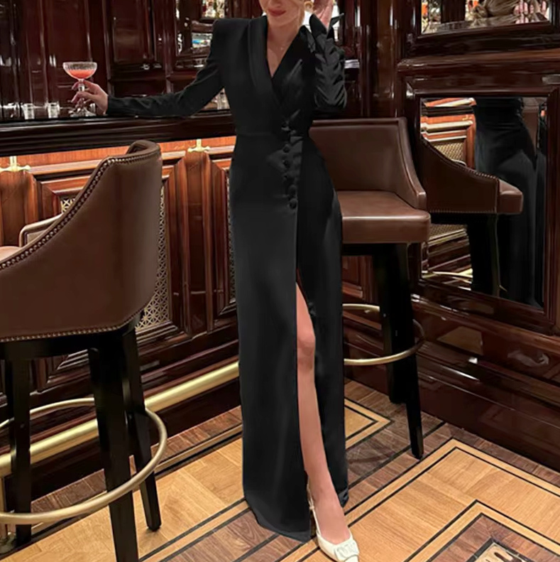 Elegant long-sleeved satin dress Darlin in black with buttons and slit