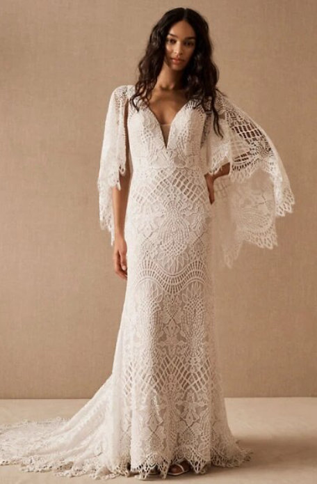 I line boho wedding dress Bärbel made of lace with bat sleeve back neckline