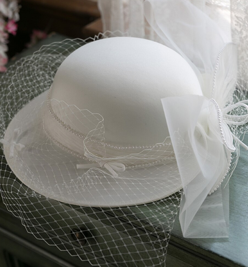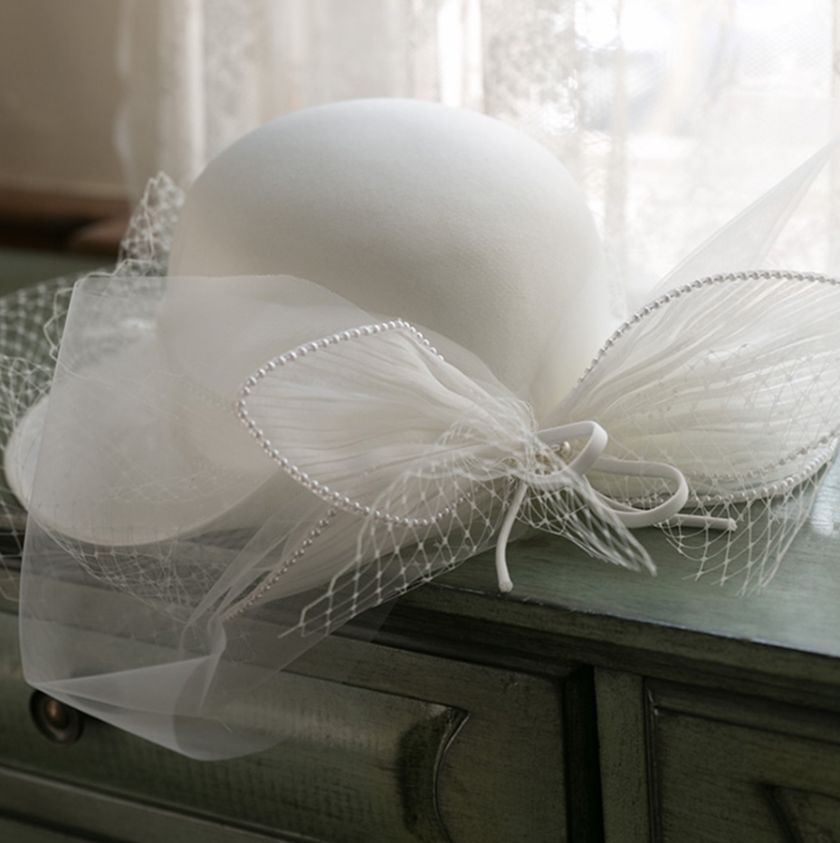 Bridal Hat Dome Hat in White with Pearls and Tulle