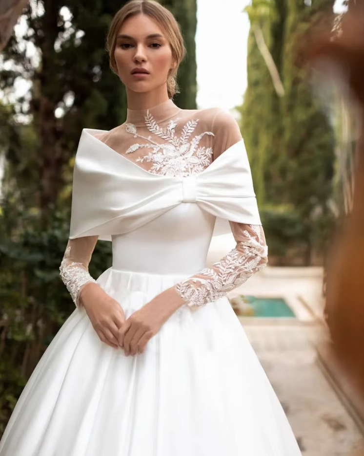Long Sleeve Satin A Line Wedding Dress Evelyn with Lace Sleeves and Train