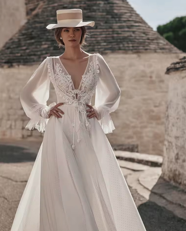 A Line Long Sleeve Chiffon Boho Wedding Dress Ernestine with V Neck and Lace