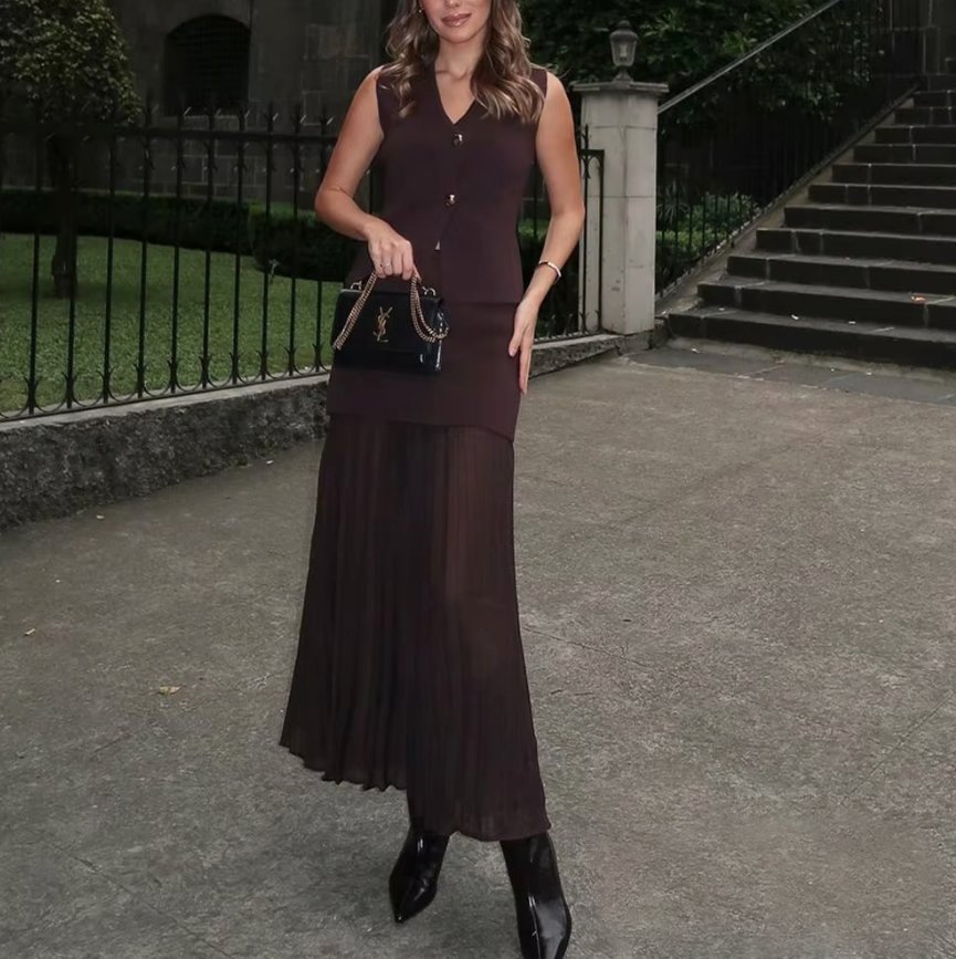 A Line Ladies Costume Elegant with Pleated Skirt and Vest in Brown