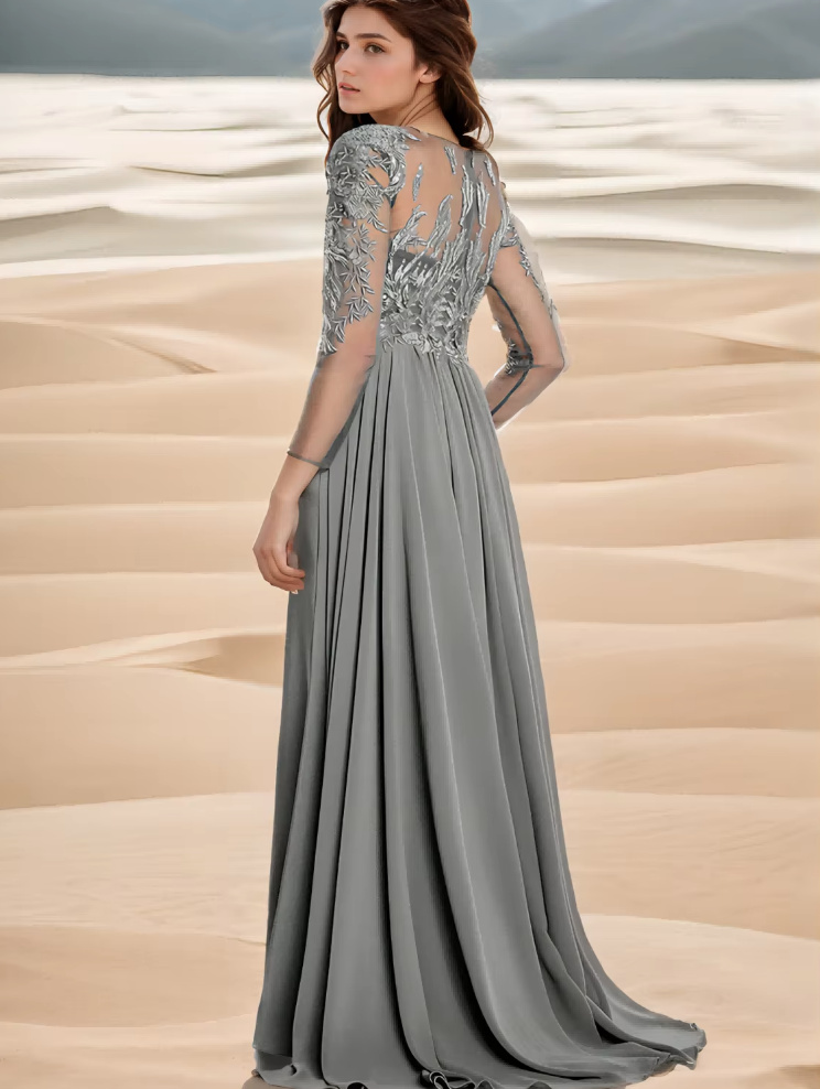 Fit and Flare Brautmutterkleid Elenor in Silber mit Ärmeln aus Spitze