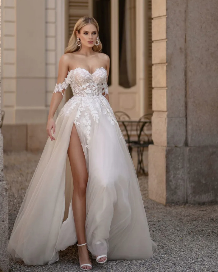 Off-the-shoulder tulle wedding dress Adrian with lace and cut out