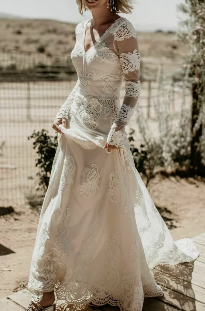 A Line Long Sleeve Boho Wedding Dress Ella made of lace with train