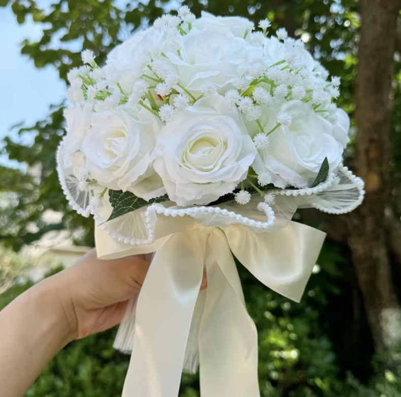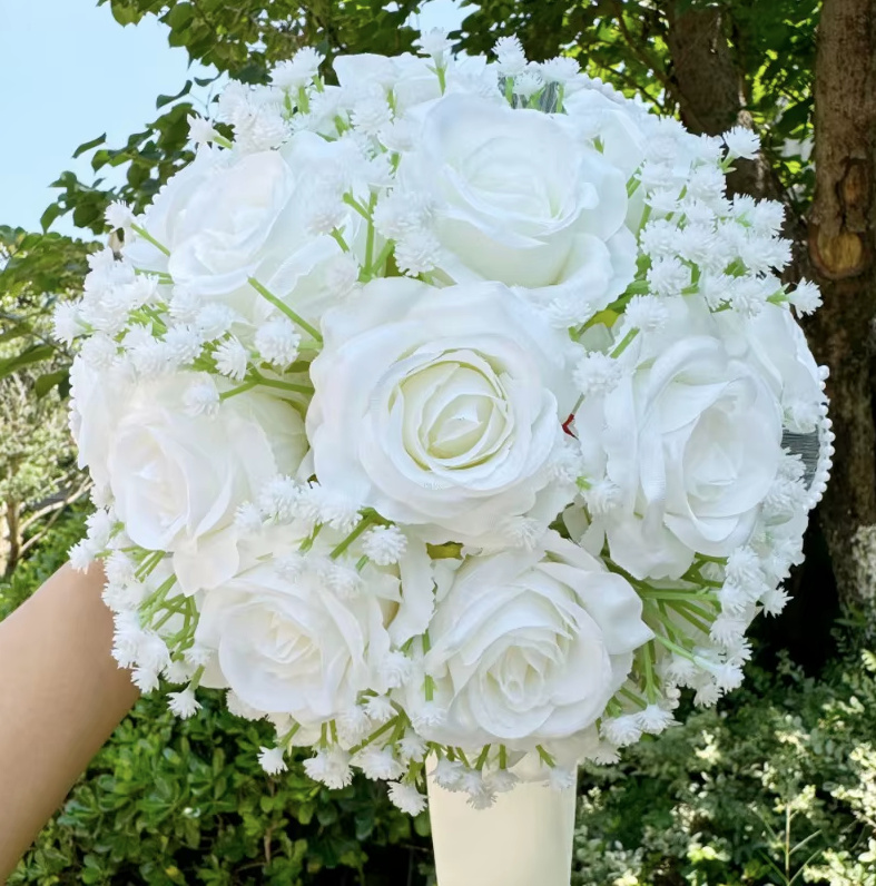 Braut Blumenstrauß Evita Rund in Weiß mit Rosen