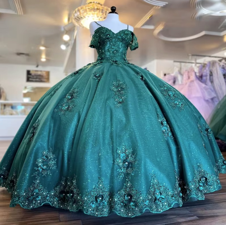 Spaghetti Strap Princess Ball Gown Dagny with Lace Off Shoulder in Dark Green