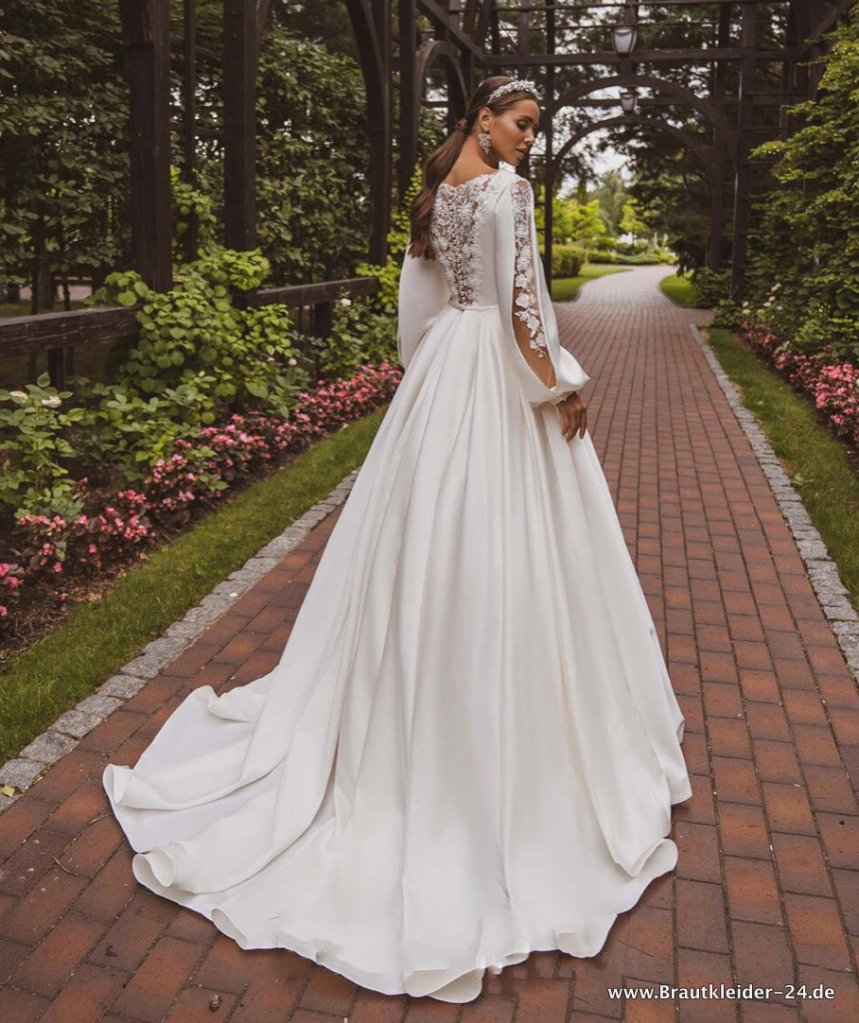 A Line Satin Long Sleeve Wedding Dress Nelli with Floral Lace