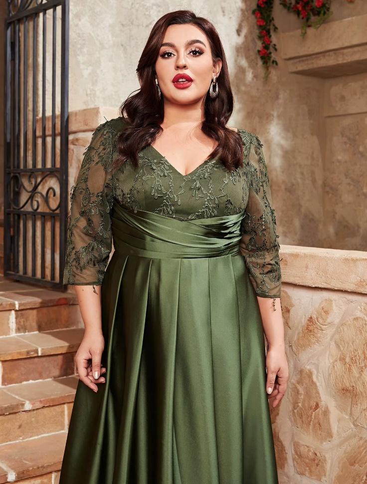 A Line Empire Dress Elegant for Wedding Guests in Green with Lace Sleeves