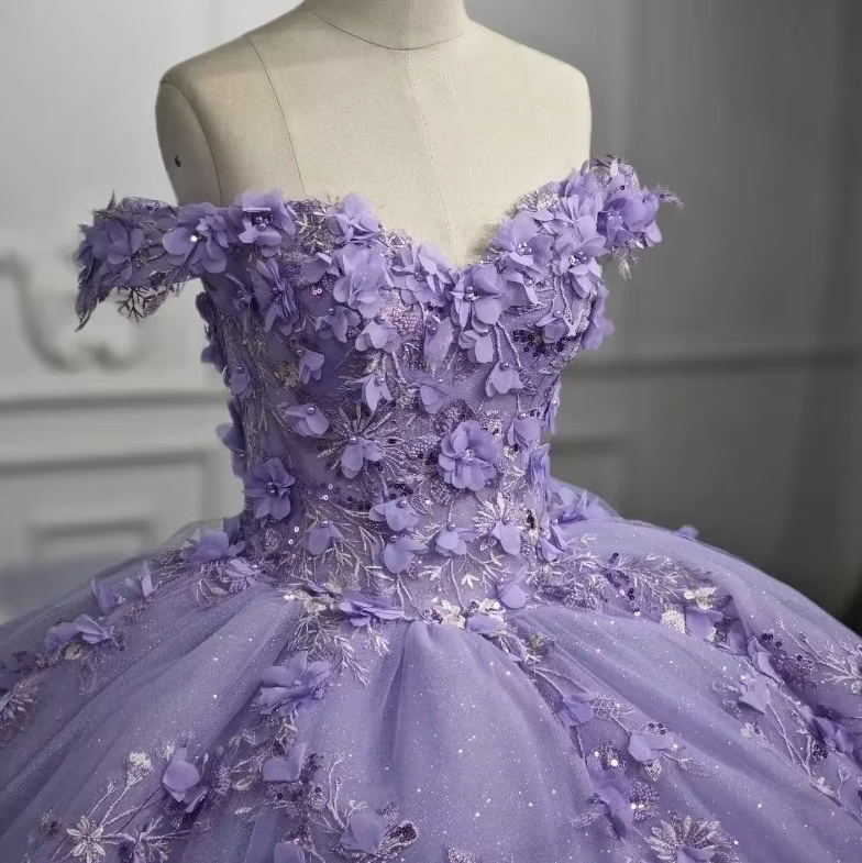 Off-the-shoulder ball gown quinceanera dress in lilac with lace and train