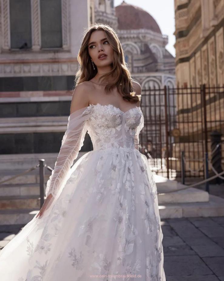 Schulterfreies Langarm Prinzessinnen Brautkleid Maren mit Pinselschleppe und Spitze
