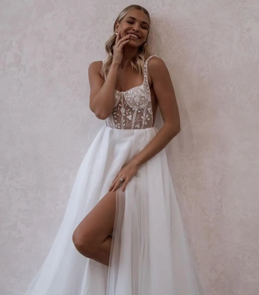 A-line spaghetti straps boho wedding dress Elena with lingerie top lace and slit