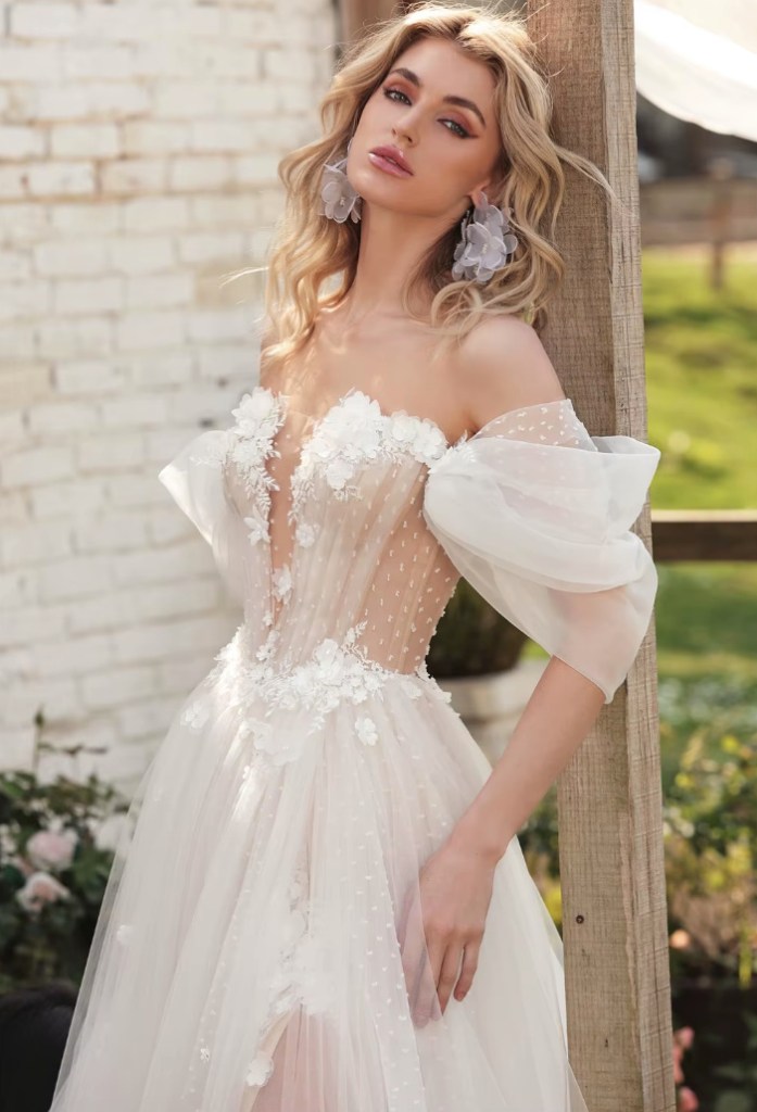 Off-the-shoulder A-line boho wedding dress Esmeralda with lingerie top slit and train