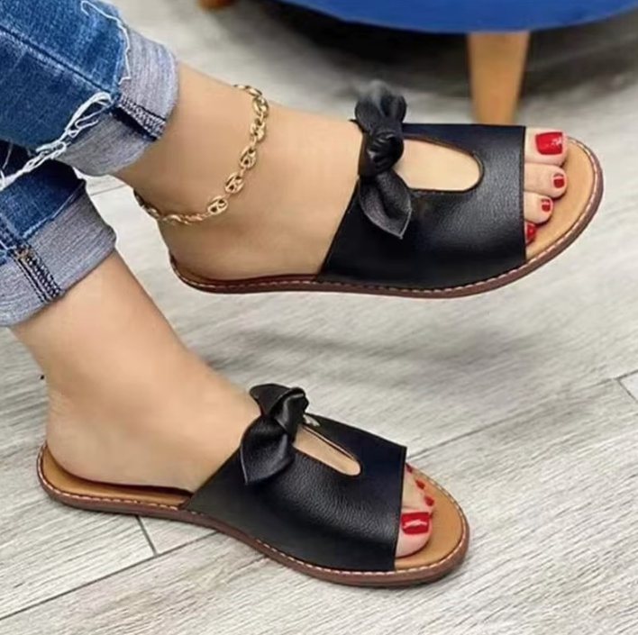 Flache PU Leder Sommerschuhe Schwarz mit Schleife