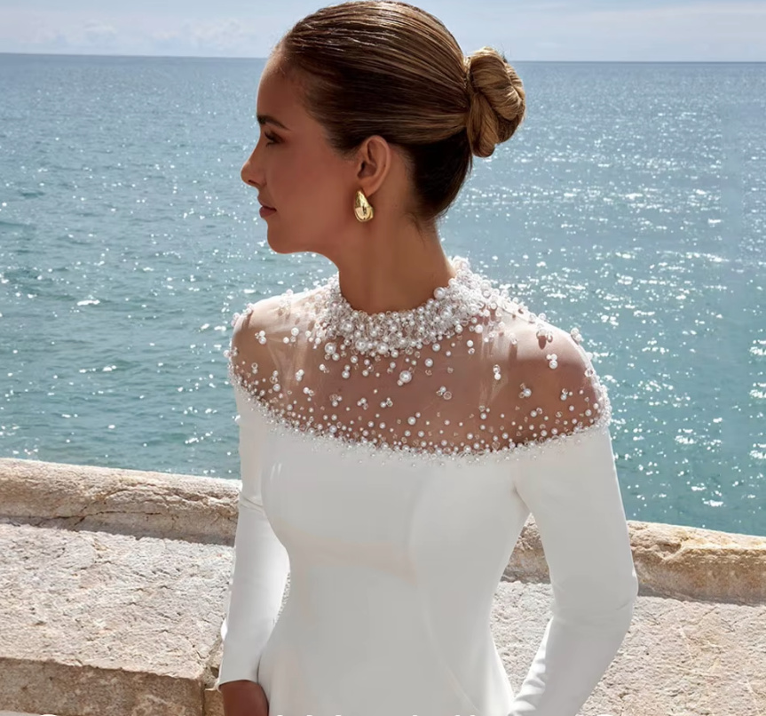 Long-sleeved fit and flare wedding dress Emelie with pearl appliqués and train