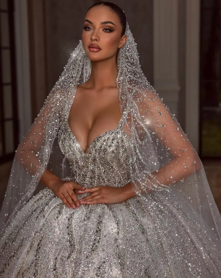 Luxury Beaded Sequin Glitter Wedding Dress Emanuele with Spaghetti Straps and Train