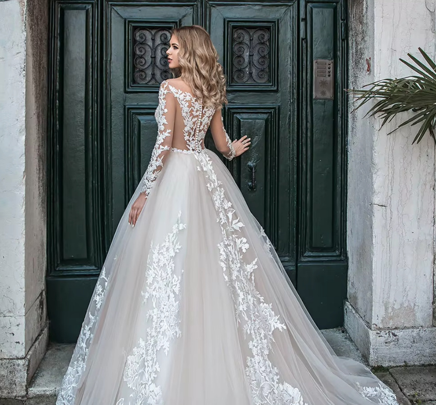 Long sleeve princess wedding dress Eliza with lace flower sleeves and train
