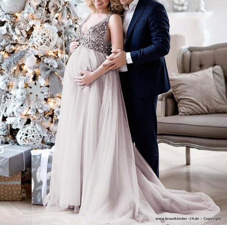 Empire Brautkleid Bodenlang für Schwangere in Silber mit Pailletten