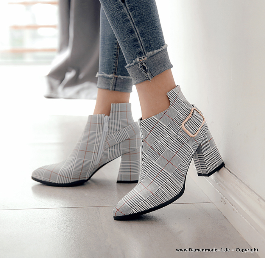 Autumn Winter Ankle Boots in Grey Checkered with Buckle and Zipper